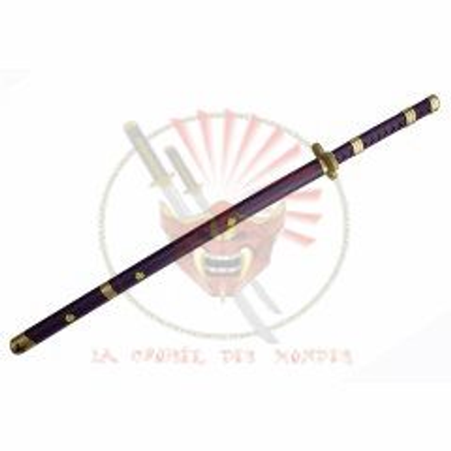 Magnifique replique du sabre Enma de Roronoa Zoro tiré du manga One Piece. Cette épée a appartenu a Kozuki Oden forgé par Shimotsuki Kozaburo. Sa lame est en mousse. Le tsuba (garde) en forme de trefle est en finition mousse. Fourreau en ABS. Manche en mousse décoré. Longueur totale : 104cm Longueur de la lame : 72cm Poids epee et fourreau : 320grs Poids epee : 170grs Ideal pour les cosplays.
